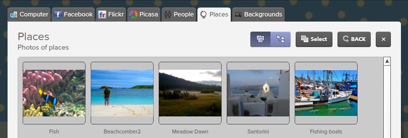 By default, the sources for images include Facebook, Flickr, and Picasa. If an end user has an account on one of those sites, they can select images that they had previously uploaded. But we have also published APIs that allow our clients to link their existing image libraries into the Gallery. In the example above from our Demo page on printui.com, you can see that we have added three additional sources called People, Places, and Backgrounds.