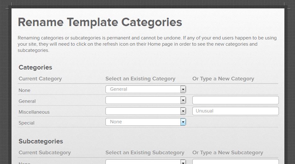 - On the Templates page, administrators can now easily rename the categories for all their templates at one time. The new Rename Categories page allows you to rename just one or two categories (or subcategories), or every single category and subcategory all at once. This is especially useful as things change over time and your end users need to have their Home pages organized differently. In addition, all unassigned templates (those shown with “None” for the category) can all be assigned to a category at one time.